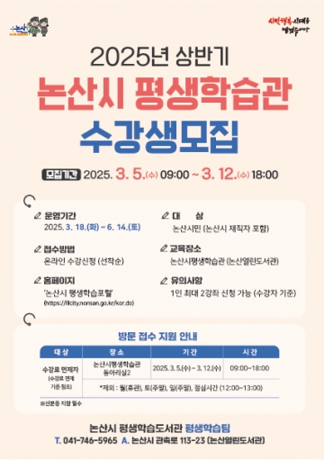 논산시(시장 백성현)가 오는 5일부터 12일까지 ‘2025년 논산시 평생학습관 상반기 정규 프로그램’ 수강생을 선착순 모집한다.