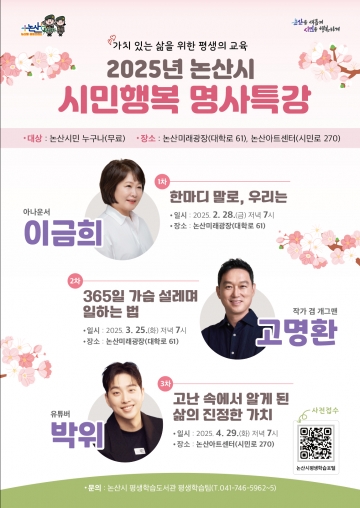 한편, 시민행복 명사특강은 논산시민이라면 누구든지 함께할 수 있으며, 논산시 ‘평생학습 포털 홈페이지(https://lllcity.nonsan.go.kr)’를 통해 사전 접수를 받고 있다.