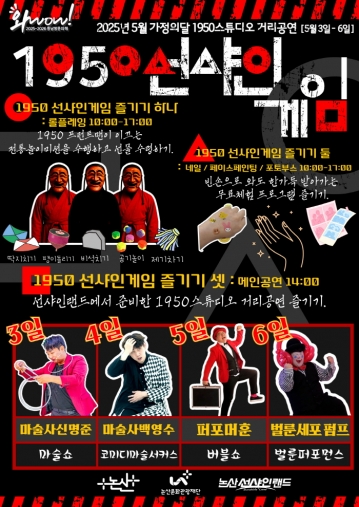 K-드라마 촬영 명소 및 K-밀리터리체험의 성지로 사랑받고 있는 선샤인랜드에서는 가정의달 및 어린이날을 맞아 “1950선샤인게임”을 주제로 1950 프론트맨이 이끄는 딱지치기, 공기놀이, 제기차기 등 미션 수행형 롤플레잉과 페이스페인팅, 네일아트, 포토부스 운영 등 다채로운 프로그램을 무료로 체험할 수 있다.
