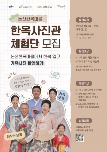 논산문화관광재단(이사장 백성현)이 운영하는 논산한옥마을에서 가족 단위 체험형 콘텐츠인‘한옥 사진관’프로그램이 오는 9월 운영을 앞두고 선착순 체험단 모집에 나선다.