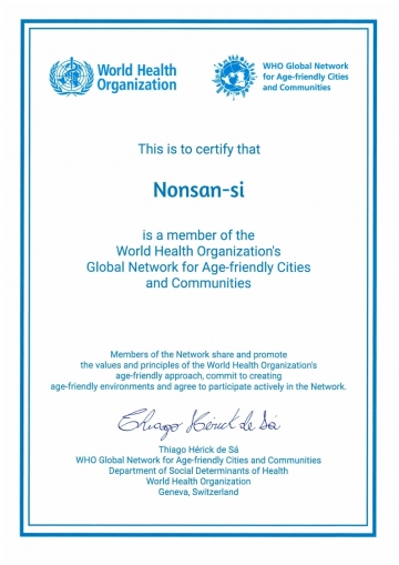논산시는 2018년 전국 8번째이자 충청남도 최초로 WHO 고령친화도시 국제 네트워크에 가입했다. 이후 2020년 2기 재인증을 거쳐 올해 9월 세 번째 인증을 받았다.