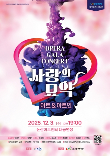 (재)논산문화관광재단(이사장 백성현)은 오는 12월 3일(수) 19시에 논산아트센터 대공연장에서 아트&아트인 <오페라 사랑의 묘약 갈라 콘서트> 공연을 진행한다고 밝혔다.