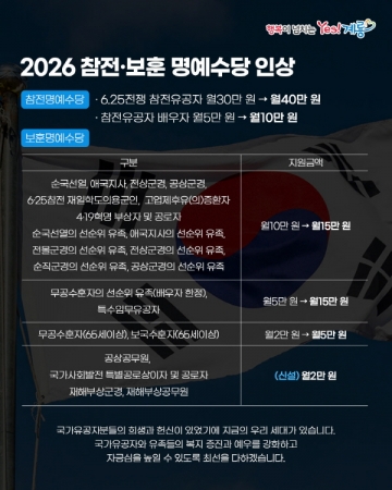 특히 2026년부터는 공상공무원, 국가사회발전 특별공로상이자 및 공로자, 재해부상군경, 재해부상공무원에게도 보훈명예수당을 신설해 월 2만 원을 지급할 예정이다.